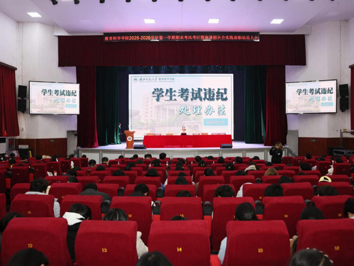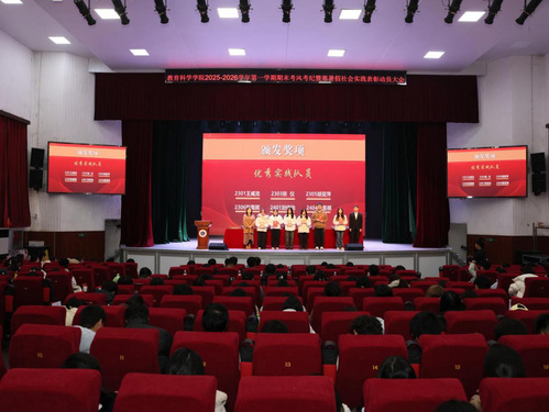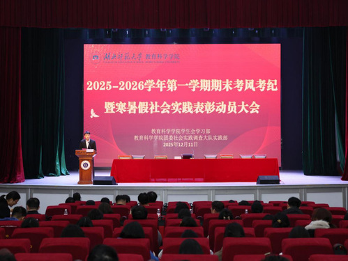 为筑牢诚信考试防线,营造公平公正的考试环境,鼓励学生参与社会实践,12月11日下午,教科院在大礼堂召开2025-2026学年第一学期期末考风考纪暨寒暑假社会实践表彰动员大会。yl23411集团党委副书记刘广兵,副院长张小菊,学工办主任秦姗姗,团委书记刘丽娟,辅导员夏青腾、夏木斯亚、吕经纬,25级各班班主任。各年级学生代表及全体24、25级本科生、研究生参会,会议由吕经纬主持。