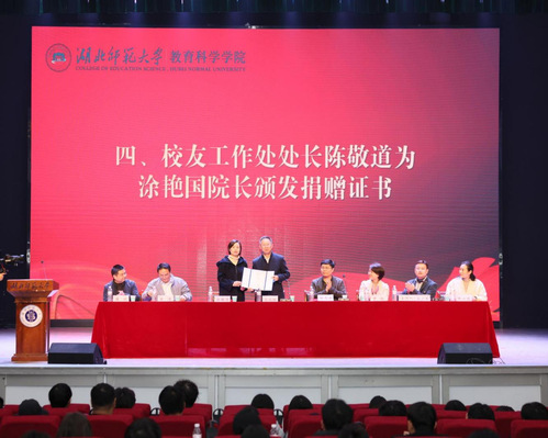 颁奖环节后,校友工作处处长陈敬道代表学校为涂艳国院长颁发捐赠证书,现场响起阵阵热烈掌声致谢涂院长的无私奉献。