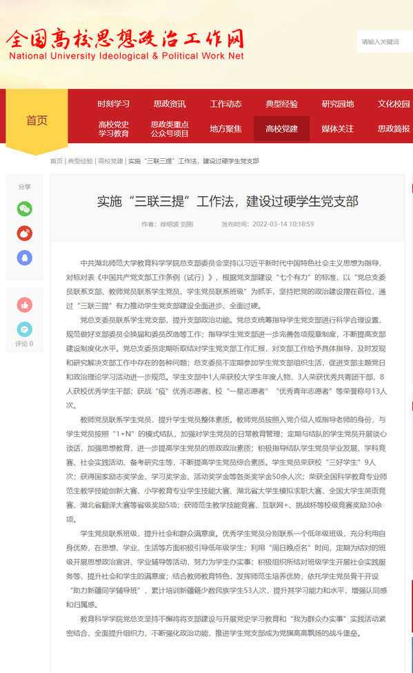 3月14日,全国高校思政网以“实施‘三联三提’工作法,建设过硬学生党支部”为题,推介我院学生党支部建设工作经验。