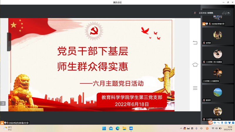 6月18日晚上,我院学生第三党支部在腾讯会议开展了以“党员干部下基层,师生群众得实惠”为主题的六月主题党日活动。我院学生第三党支部全体党员参加了本次活动,活动由我院第三党支部书记秦姗姗主持。