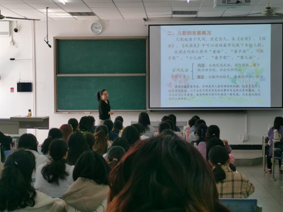 2023年3月14日上午,yl23411集团在科技大楼9408进行示范课观摩活动。本次主讲教师是小学教育系朱培芳老师,主讲内容为《儿童文学》中的《儿歌》部分。学校督导张海丽教授、崔波副院长和学院部分教师参与了听课。