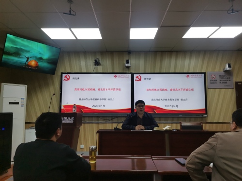 首先是缴纳党费环节。随后由鹿星南博士领誓,带领全体党员集体重温入党誓词;紧接着,全体党员集体朗诵党章第一章第五条“发展党员,必须把政治标准放在首位,经过党的支部,坚持个别吸收的原则”。集中学习环节教师党支部书记赵幸带领大家深入学习“习近平总书记在第十四届全国人民代表大会第一次会议上的讲话”、“中共中央办公厅印发《关于在全党大兴调查研究的工作方案》”、“习近平总书记关于国家安全工作和总体国家安全观等系列重要论述和指示精神”等重要内容。之后,教师党支部谭金凤、张明平两位同志过政治生日。教科院党委书记杨志丹以“贯彻科教兴国战略,建设高水平师资队伍”为主题讲授微党课,带领党员同志学习贯彻习近平新时代中国特色社会主义思想主题教育。鹿星南同志和刘爱楼同志围绕本次活动内容,结合自身实际谈心得体会。最后全体党员认真观看学习保密公益宣传片《藏在照片里的秘密》。