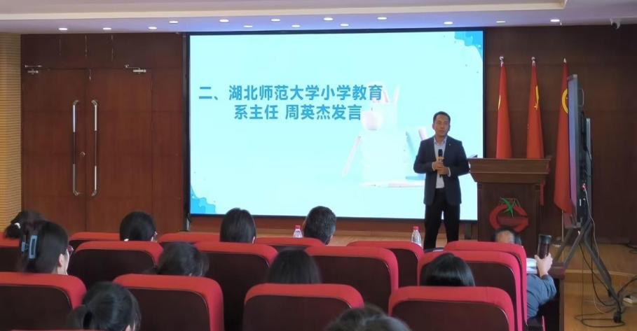 小学教育系主任周英杰发言,对实习学生提出了“三个感恩”:感恩老师、感恩学生、感恩学校;做到“三个不负”:不负老师的教诲、不负珍贵的时间、不负社会国家对我们的期待。