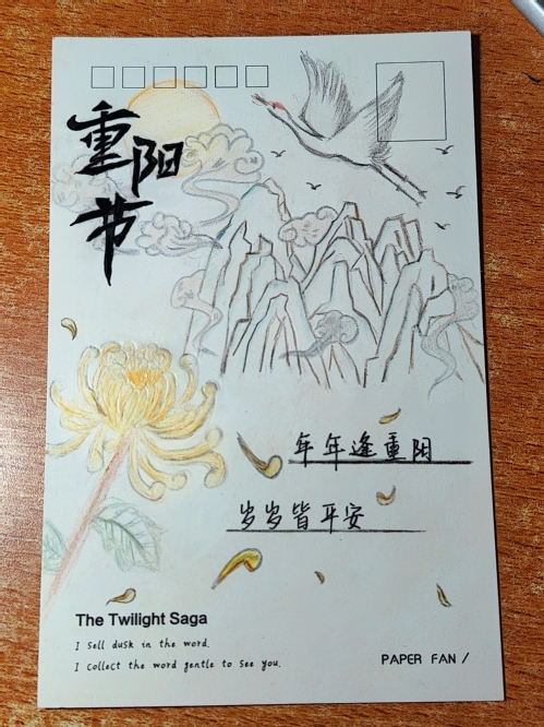 为深化同学们对重阳节的认识,让更多的人了解并传承中华民族的优秀传统文化,yl23411集团学生会权益部于10月11日至10月17日线上开展了此次“重阳绘彩意,明信传温情”活动。本次活动由学生会权益部负责人张芷桐、吴薇薇策划组织,吸引了众多yl23411集团学生的参与。