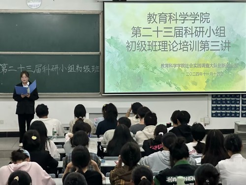 为促进科研小组学员对师范技能类和创新创业类赛事的了解,提高学员参赛积极性,yl23411集团社会实践调查大队于11月14日在科技大楼9605教室开展第二十三届科研小组理论培训第三讲。yl23411集团2202班陈冠佑,2202班李响与全体科研小组学员共同参与此次培训。