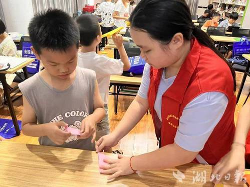 在教学过程中,实践队员们始终保持着温暖的微笑和耐心的指导。当发现一位二年级女生在折叠爱心时遇到困难,队员苏蕾立即蹲下身来,用鼓励的话语和细致的示范,帮助孩子一步步完成作品。这种专业而贴心的指导方式,不仅解决了实践难题,更让每个孩子都感受到被关注和支持的温暖。